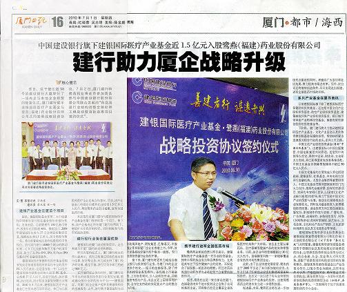 鷺燕(福建)藥業(yè)股份有限公司與建銀國際醫(yī)療產(chǎn)業(yè)股權(quán)投資有限公司于2010年6月30日在廈門簽署戰(zhàn)略投資協(xié)議。